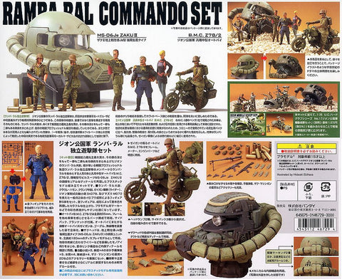 This fantastic Ramba Ral Commando set features 1/35-scale kits of Lieutenant Ramba Ral, Kramp, Crowley Hamon, and three Zeon soldiers, plus a motorcycle, a Zaku II head, and tons of weapons, spent ammunition, and flasks to decorate your diorama. The set comes with the exquisite detail that you would normally expect from scale model kits of tanks and vehicles. A great challenge for both experienced and casual modelers alike!